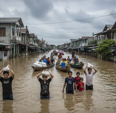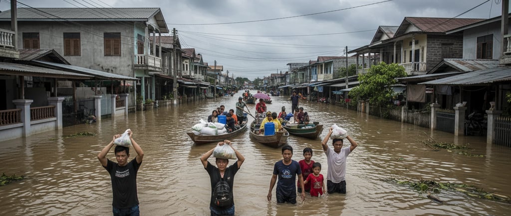 Chuvas intensas de monção causaram cheias e deslizamentos em partes da Indonésia, Tailândia e países vizinhos, desalojando milhares de pessoas e destruindo infraestruturas. Equipas de resgate usam barcos para evacuar famílias de bairros inteiros submersos.