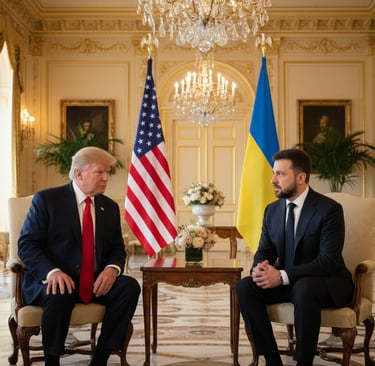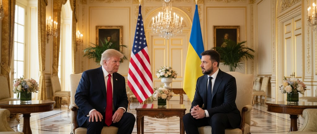 O presidente ucraniano Volodymyr Zelenskiy reuniu‑se com Donald Trump em Mar‑a‑Lago para discutir um plano de paz que inclui garantias de segurança dos EUA por 15 anos, possível zona desmilitarizada no leste da Ucrânia e arranjos especiais para a central nuclear de Zaporizhzhia. Questões territoriais continuam sem acordo e podem ir a referendo na Ucrânia.